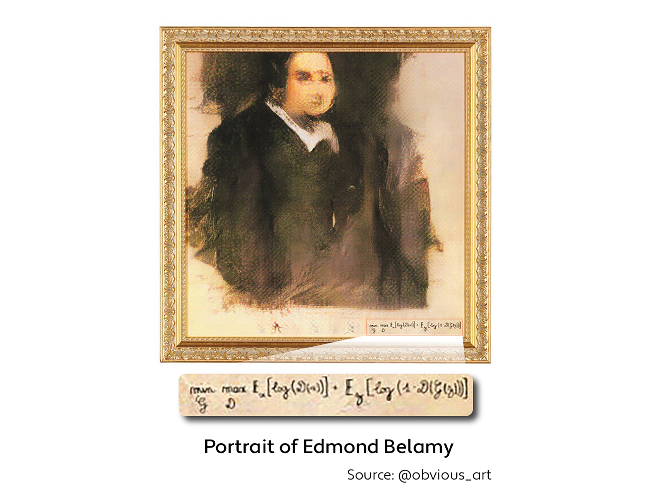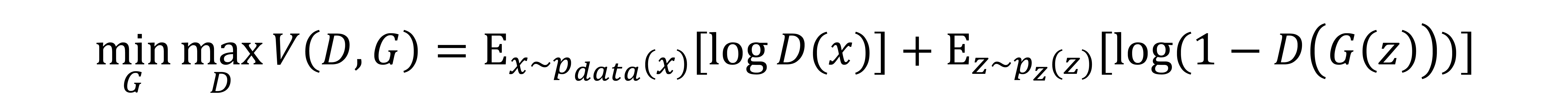 The first term on the right-hand side of the formula represents the likelihood of the real sample passing through the discriminator; the second term is the likelihood of the synthetic sample not passing through. The aim of the discriminator is to maximize this function so that in the most ideal case all real samples will pass through and synthetic samples won’t. The generator’s job is exactly the opposite — to minimize the function. The two networks engage in this zero-sum game until the model reaches an equilibrium. In fact, the signature in the Edmond Belamy painting is a version of this formula.